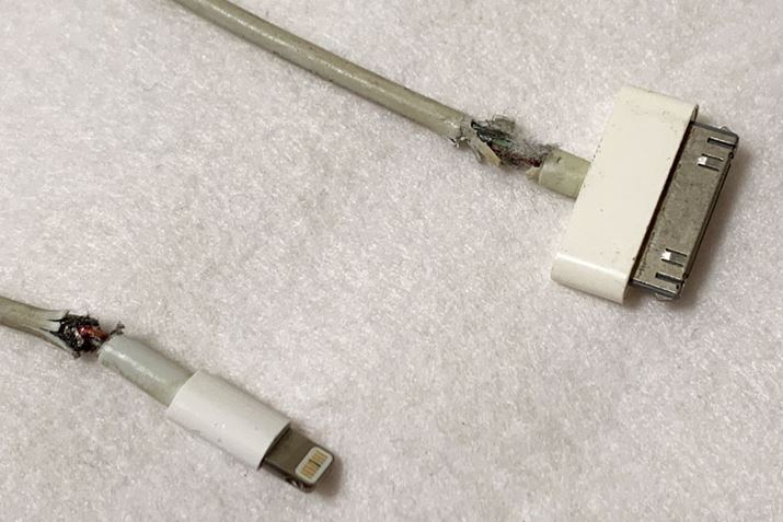 被覆が破れたケーブル。まるでゾンビみたいですが、買い替えなくてはならない不条理に納得できず、いまだ捨てられずにいます