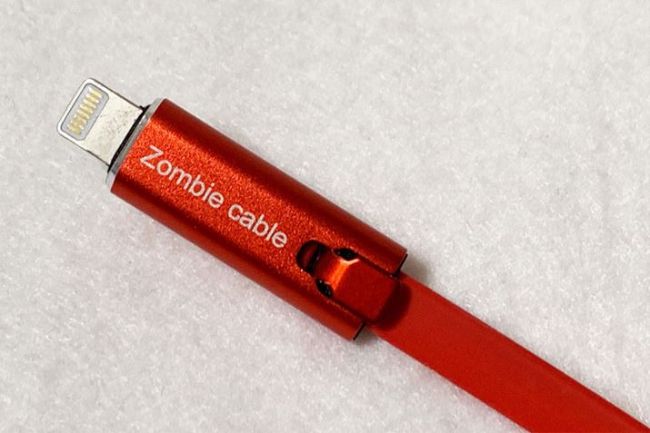 「ゾンビケーブル」は、充電用のUSBケーブルで(充電のみでデータ転送には対応していないのでご注意ください)、スマホなどに接続する側のコネクター部が取り外し可能になっているのが特徴。そのため、ケーブルの根元が断線した場合や、被覆が破れて切断間近な際にケーブルを切断、再度コネクターを装着することでケーブルがゾンビのように蘇るという代物です。