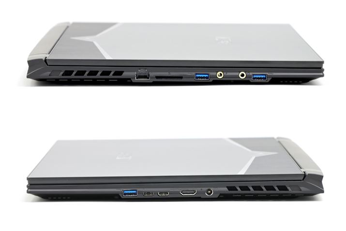 外部インターフェイスは両側面の中央から手前に配置されており、ケーブルの抜き差しがしやすい。左側面にUSB 3.1 (Gen1)ポート×2、SDメモリーカードスロット、ギガビットLANポート、ヘッドホン出力端子、マイク入力端子を、右側面にUSB 3.1 (Gen1)ポート、HDMI2.0、DisplayPort 1.4兼USB 3.1 (USB Type-C)、Thunderbolt 3(USB Type-C)を装備