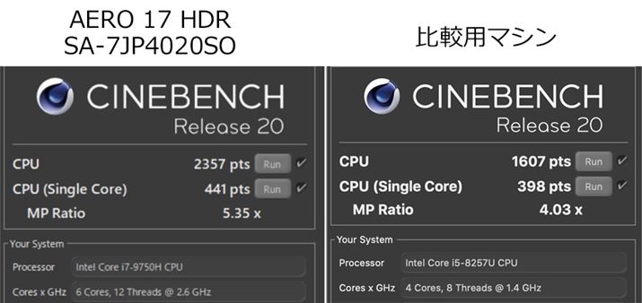 「AERO 17 HDR SA-7JP4020SO」が搭載する「Core i7-9750H」は、ベース動作周波数とターボ・ブースト利用時の最大周波数の両方が高く、「CINEBENCH R20」の結果も良好。比較用のマシンは2019年発売の最新モデル(「Core i5-8275U」搭載)だが、「Core i7-9750H」のほうがCPU性能ははるかに高い
