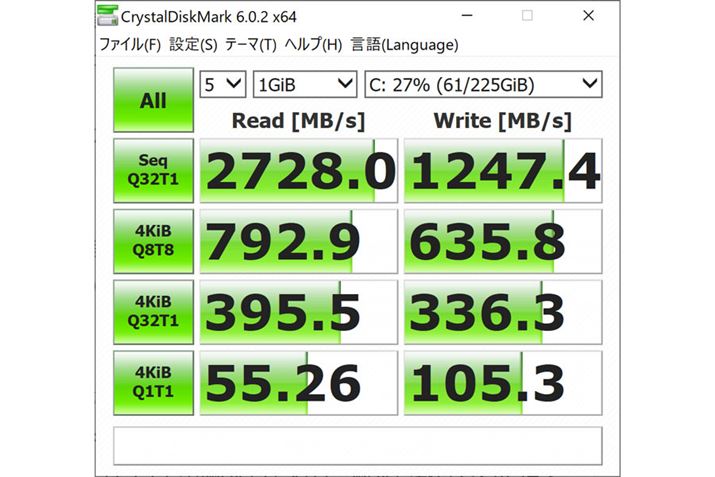 アプリの起動やデータのコピー、ファイルの圧縮・解凍など、日常使いの快適さを左右するSSDには、NVMe接続の「Intel SSD 760p」を搭載している。こちらもストレージの読み込み、書き込み速度を測定する定番アプリ「CrystalDiskMark 6.0.2 x64」で速度を測ってみた。結果は、読み込みが2728MB/s、書き込みが1247MB/s。読み込み、書き込みともに高速で、動作も軽快だ。インテル製というのも心強い。