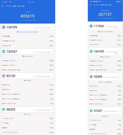 AnTuTuベンチマーク(Ver.8.0.1-OB)を使ったベンチマークテスト結果。左が本機のスコアで、右が「Pixel 4」のスコアだ。トータルスコアでは本機のほうが高く、特にUFS 3.0を採用したことでMEMのスコアが高い。いっぽうで、GPUのスコアは少し不利となった