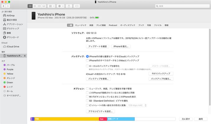iPhoneのバックアップをMacで取っているという人は、バックアップがさらに簡単になる。iOSの管理機能がFinderに搭載され、接続してiPhoneを選択するだけで、この画面が表示される