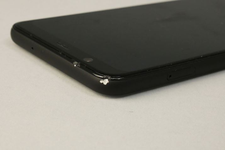 1.5mくらいの高さから落下し、端末の角の部分が破損。破損具合からみて、角から落下したと思われる。ディスプレイもほんの少し削れているが、ひび割れまではいかなかった