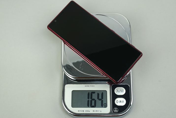 SIMカードを挿した状態で、手元のデジタルスケールを使って計測した重量は、カタログスペック値通りの164gだった。特別に軽いわけではないが、昨今のハイエンドスマホの中では軽い部類に入る