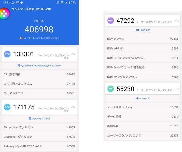 AnTuTuベンチマークのスコア。GPUのスコアが17万点を超えており、「Snapdragon 710」を搭載するミドルクラスモデルOPPO「Reno A」と比較しても3〜4倍ほど高い