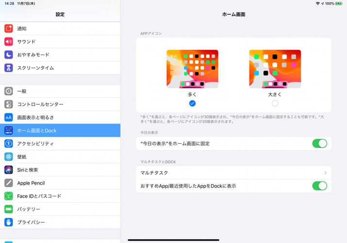 ひとつは、アイコンの表示スタイルを選べる点だ。設定アプリの「ホーム画面とDock」から、「多く」と「大きく」が選べる。