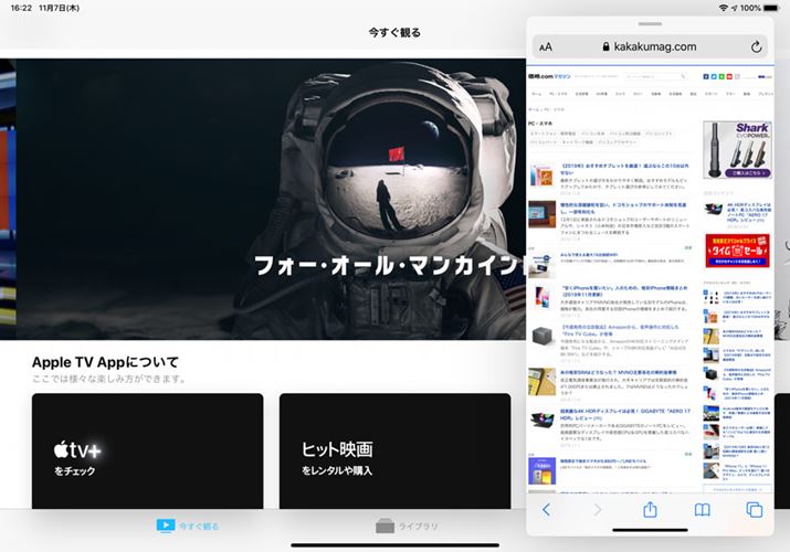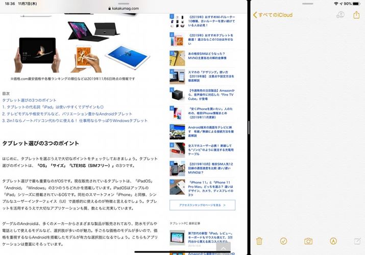ホームページを閲覧しながら地図で場所を確認、あるいはメモを取る。共有文書を表示したまま「FaceTime」で会話をする。異なるホームページを2画面並べて表示して比較するなどさまざまな使い方ができ、作業効率が大幅にアップする。