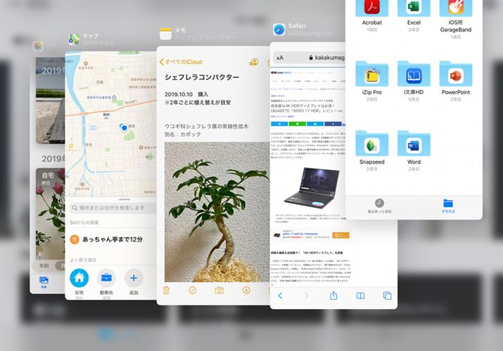 また、同じ下端のバー部分を上方向にスワイプするとAppスイッチャー画面になり、起動している全アプリのSlide Over画面を一覧表示できる。ここから、必要なアプリをタップして表示を切り替えることも可能だ。
