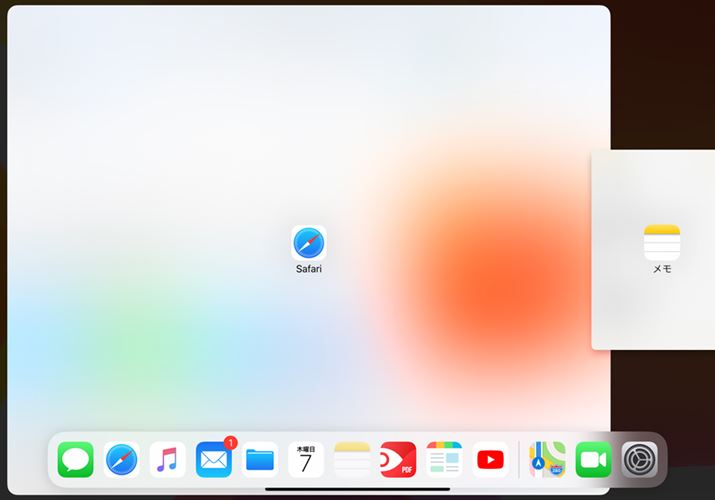 Dock上にあるSplit Viewで表示したいアプリを、画面右端または左端までドラッグする。はじめに開いていたアプリの背景が変わり、右端へのドラッグなら右側、左端へのドラッグなら左側に配置スペースができるので、指を離す