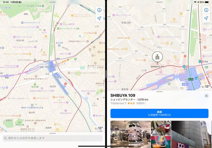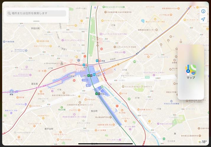 「地図」アプリの2画面で、Split Viewにできた。この例では同じアプリが起動したが、ドラッグする内容に合わせて起動するアプリは変化する