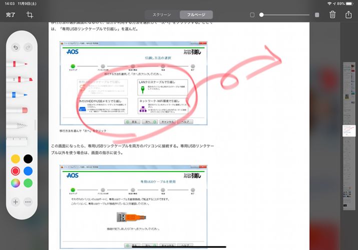 Webページをキャプチャして「フルページ」を選択。画面右に、全体のプレビューが表示される。ツールパレットが表示されるので文字や図形などを書き込み、そのままメールで送信したり、保存場所を指定して保存ができる
