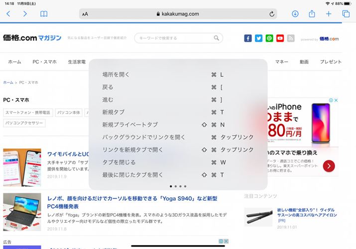 文書作成時のコピーやペースト、書体の変更などが素早くできるし、特にSafariには多くのキーボードショートカットが用意されているので、キーボードを使っているのなら上手に活用したい。
