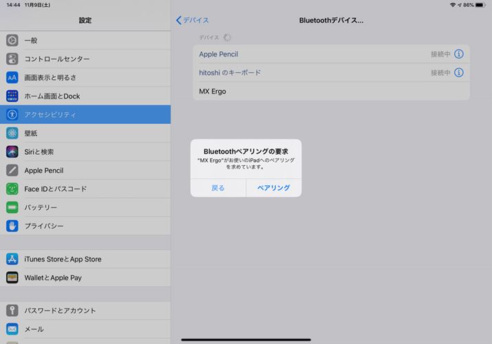 Bluetooth マウスの接続は、設定アプリの「アクセシビリティ」から行う。今回は、ロジクールの「MX Ergo Wireless Trackball」を使って接続してみた。