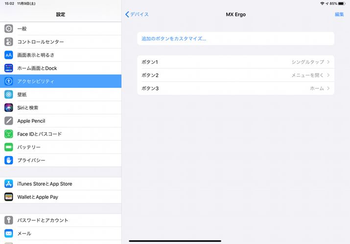 設定変更は、接続設定したAssistiveTouchの画面から行う。画面を開くと「接続済み装置」にマウスが表示されるのでタップ。各ボタンに割り当てられた機能が表示される。タップするとメニューが開き、割り当て操作を変更できる。