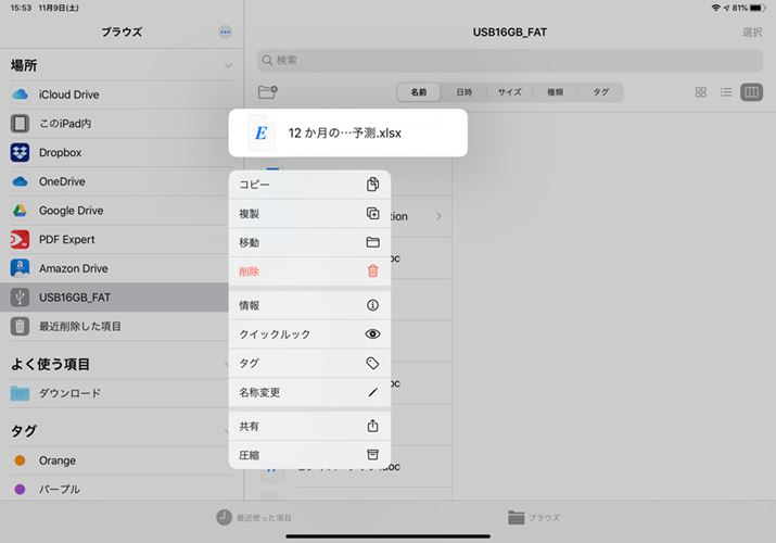 「ファイル」アプリを起動すると、「場所」の一覧にUSBメモリーが表示されるので選択する