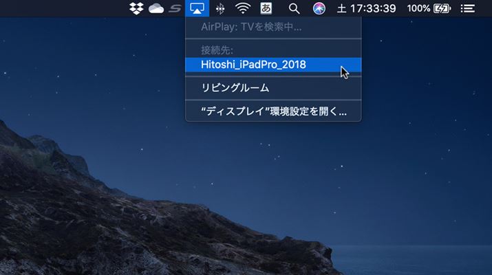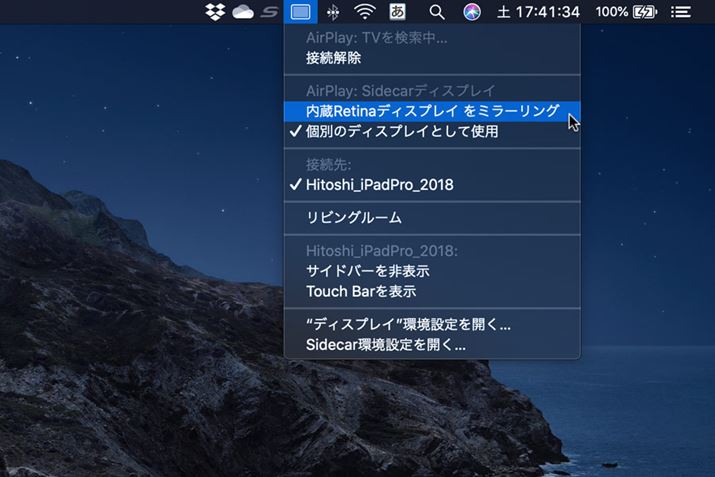 デスクトップの拡張とミラーリングは、AirPlayアイコンから切り替える。