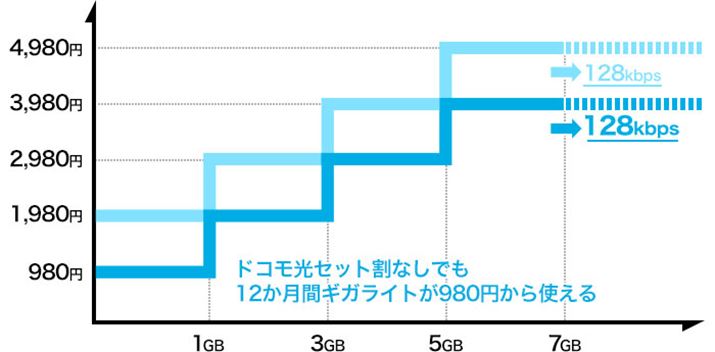 段階制料金プラン「ギガライト」では、月額2,980円(1GBまで、定期契約あり)に対して、月額1,000円の割引が最大12か月間適用される。なお、家族割引の「みんなドコモ割」(2回線:月額500円、3回線以上:月額1,000円)と、固定回線とのセット割引である「ドコモ光割」(〜1GB:割引なし、〜3GB:月額500円、3GB以上:1,000円)が併用可能となっており、契約当初12か月については最大月額980円で利用できる(月間通信1GB未満、3人以上で「みんなドコモ割り」を契約した場合)。