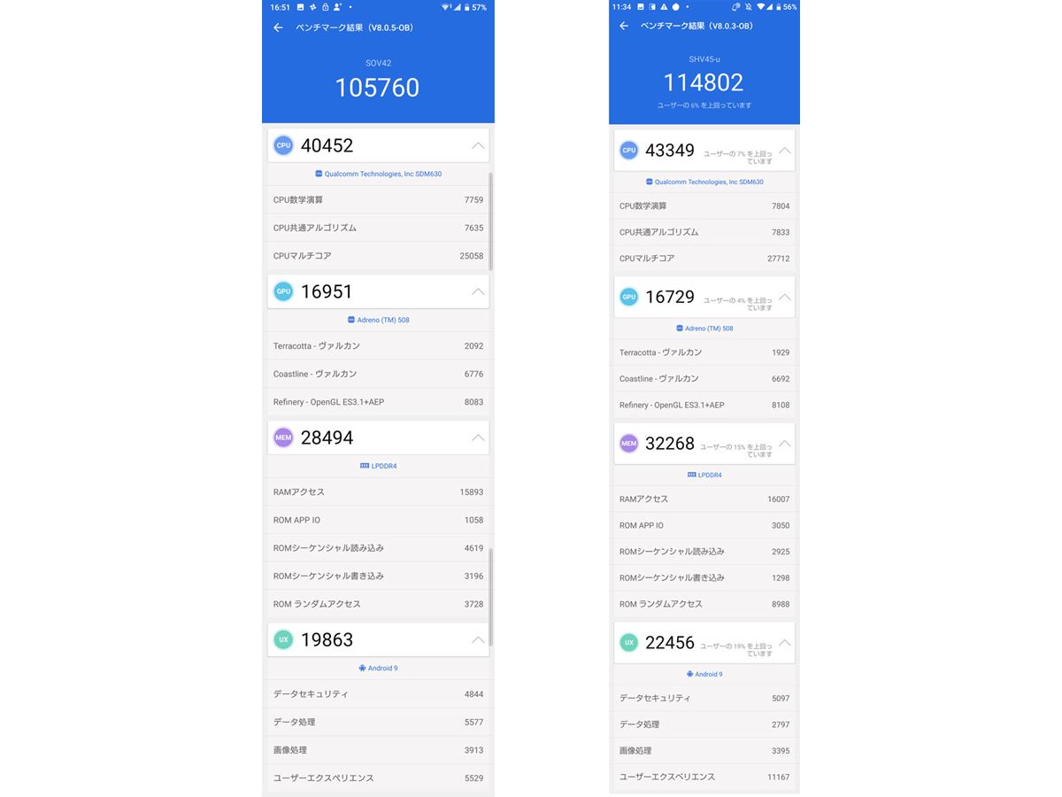 AnTuTuベンチマークの計測結果。左が本機、右が「AQUOS sense3」のもの。両機とも基本スペックがほぼ同じということもあり、スコアは1割程度の違いにとどまっており、ほぼ同等と言える