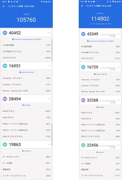 AnTuTuベンチマークの計測結果。左が本機、右が「AQUOS sense3」のもの。両機とも基本スペックがほぼ同じということもあり、スコアは1割程度の違いにとどまっており、ほぼ同等と言える