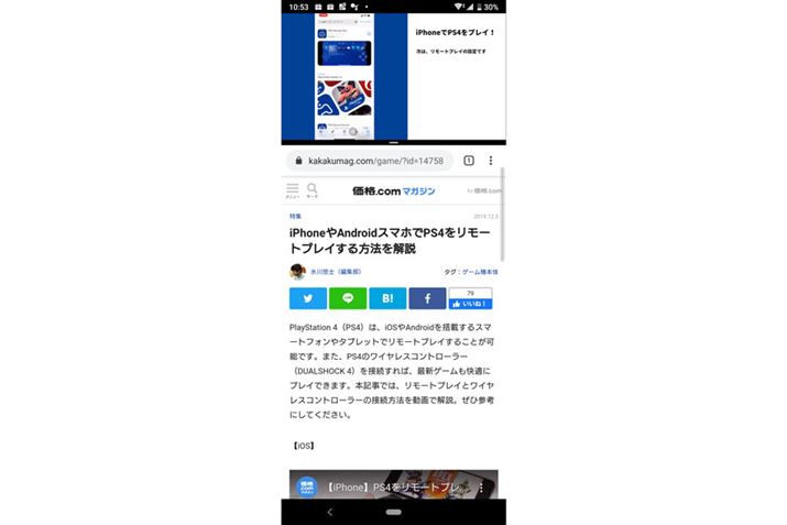 画面の上部に動画を、下部にWebブラウザーを2画面表示させた。超縦長ディスプレイはこうした2画面表示でも便利だ
