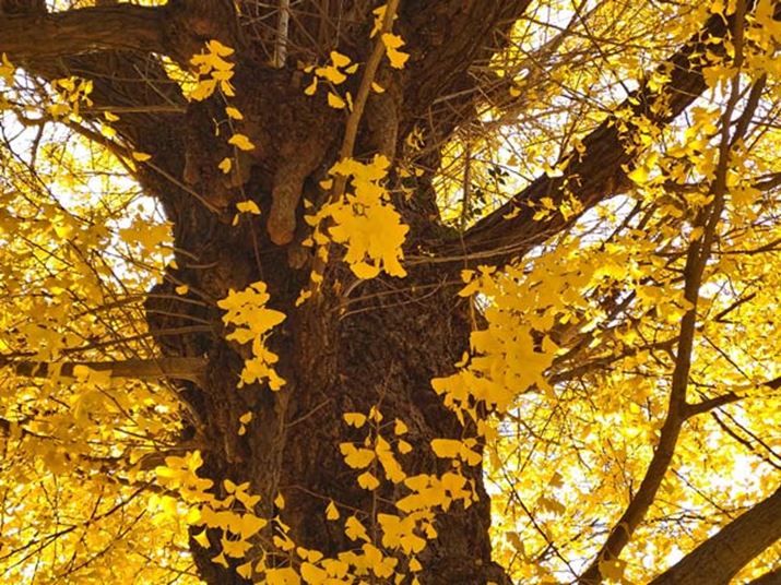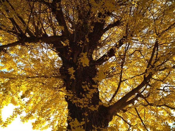 紅葉した銀杏の木を逆光で撮影。HDRがよく効いており、ハイライト部分から陰となる幹の質感まで肉眼の印象に近い仕上がりとなった