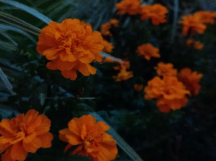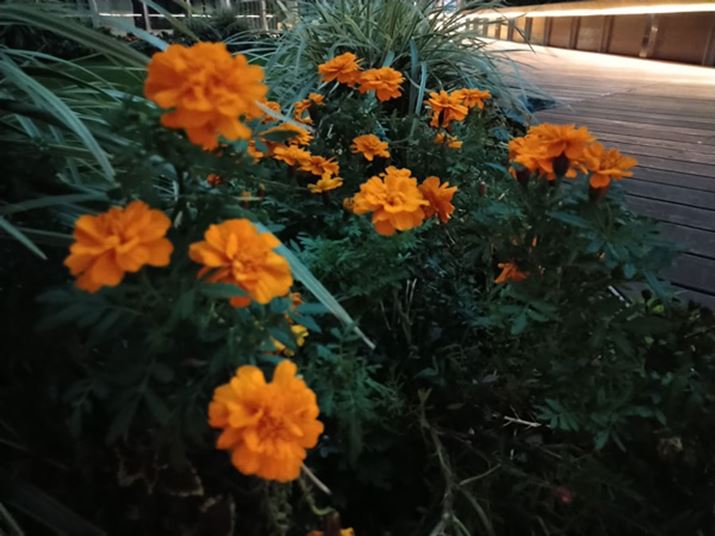 夜の花壇を撮影。感度がISO2000までアップしている。中央の構図にピントを合わせたがディテールははっきりしない