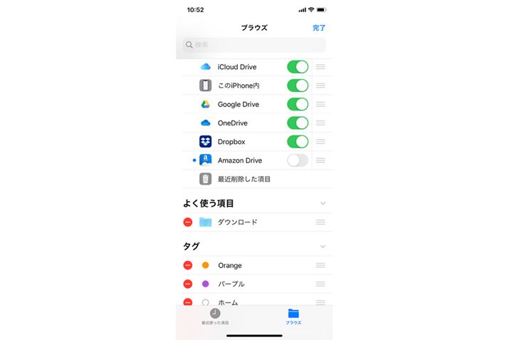 連携させたいサービスをオンにする。右端の横三本線ボタンを上下にドラッグすれば、表示順の入れ替えも可能だ。この画面は、「ブラウズ」画面の右上にある「…」ボタン→「編集」からいつでも表示できる