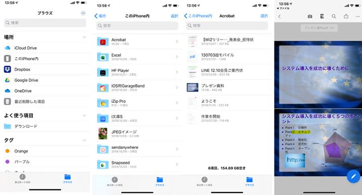 左から順に、「ブラウズ」画面の「このiPhone内」→「Acrobat」→「プレゼン資料」とタップしてファイルを開いた例。「ファイル」アプリ内では左上の「<」をタップすると、ひとつ上の階層に戻る。アプリでファイルを開いた場合は、左上の「ファイル」をタップすれば「ファイル」アプリに戻る