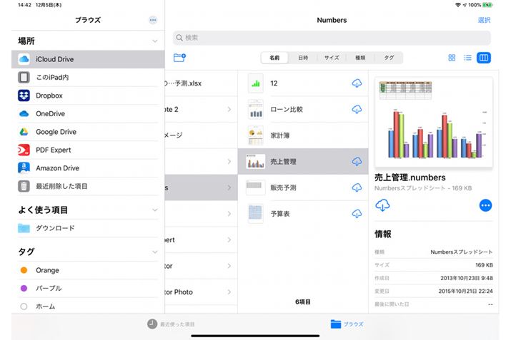 iPadの場合は、表示スタイルに「カラム表示」も選べる。今いる階層がわかりやすく、アプリを起動することなくファイルの内容をプレビューしてくれるので、便利だ。