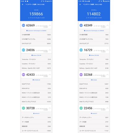 AnTuTuベンチマークの計測結果。左が本機、右が「AQUOS sense3」のもの。サブスコアも含めてまんべんなく3〜4割程度の処理性能アップを実現している