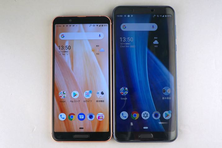 「AQUOS sense3」(写真左)と本機(写真右)を並べてみた。基本的なデザインは同じだが、本機のほうがやや縦長