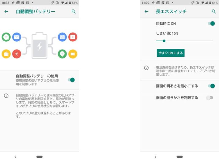 ソフトウェアによる節電機能は、Androidの標準機能である「自動調整バッテリー」(左画面)と、シャープ独自の「長エネスイッチ」(右画面)の2種類を備えている。