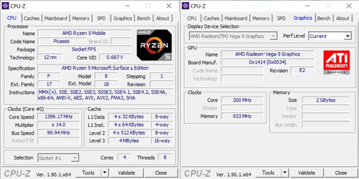 Ryzen 5 3580U Microsoft Surface エディションは4コア8スレッド。統合GPUはRadeon Vega 9 グラフィックス Microsoft Surface エディション