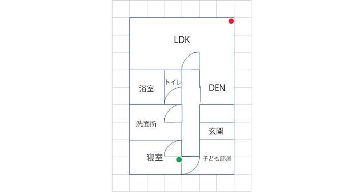自宅は約80平米で、赤色の場所に無線LANルーターを設置していたが、無線LANルーターからドア2枚を隔てた寝室では通信速度がかなり悪かった。そこで、赤の場所に「Google Nest WiFi」を、緑の場所に「Google Nest WiFi拡張ポイント」を設置したところ、寝室で速度の大幅な改善が見られた