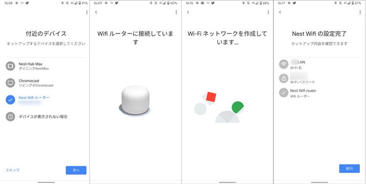 スマホとBluetoothで接続し、デバイスを選択。あとはSSIDの名前やパスワードを設定するだけ初期設定は完了。ややこしいネットワークの設定などは一切なし。「Google Nest WiFi拡張ポイント」の設定も簡単だ
