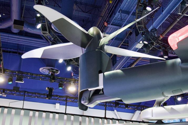 ローターは離陸時には写真のように上を向き、高速飛行時には前方を向かせることで安定した垂直離陸と高速飛行を両立させることを目指した設計となっています