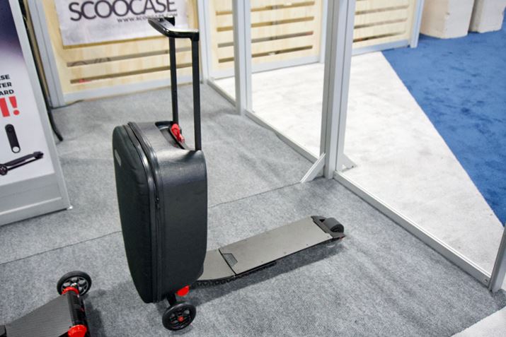 CESの中でも比較的尖ったプロダクトが集まる「Sands Expo Convention Center」の小さなブースに展示されていた「Scoocase(スクーケース)」。ブースに人がおらず、調べてもあまり詳しいことがわからなかったのですが、公式サイトの情報によれば「ビルトイン電動モーターと革新的なステアリングシステムのおかげで、スーツケースはボタンをひと押しするだけで電動スクーターになります」と記載されています。