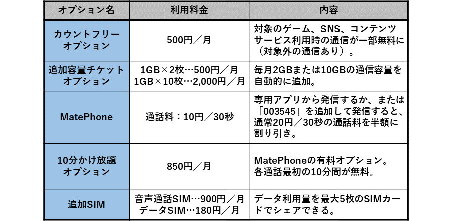 最後に、LinksMateのオプションをチェックしておきましょう。LinksMateではカウントフリーオプションだけでなく、音声通話SIM向けの「10分かけ放題オプション」(月額850円)をはじめとした、格安SIMで一般的なオプションが用意されています。