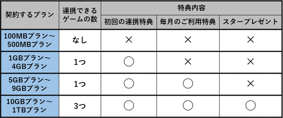 3種類の特典すべてが得られるのは毎月10GB以上のプランで、連携できるゲームの上限は3タイトルまで。毎月5GBから9GBまでのプランで連携できるゲームは1タイトルのみで、得られる特典は「初回の連携特典」と「毎月のご利用特典」の2種類です。