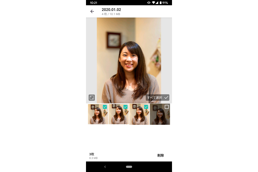 「整理対象」画面に似たような写真がリストアップされるので選択し、この画面で残したい写真を選んで不要な写真を削除する