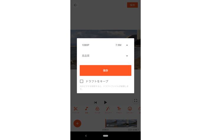 指定できたら、オレンジ色の「✓」をタップし、表示される画面で「保存」をタップする。保存画面では、動画の解像度と、品質を選択できる。「ドラフトをキープ」は、編集情報を保持するかどうかだ。最後に「保存」をタップする。