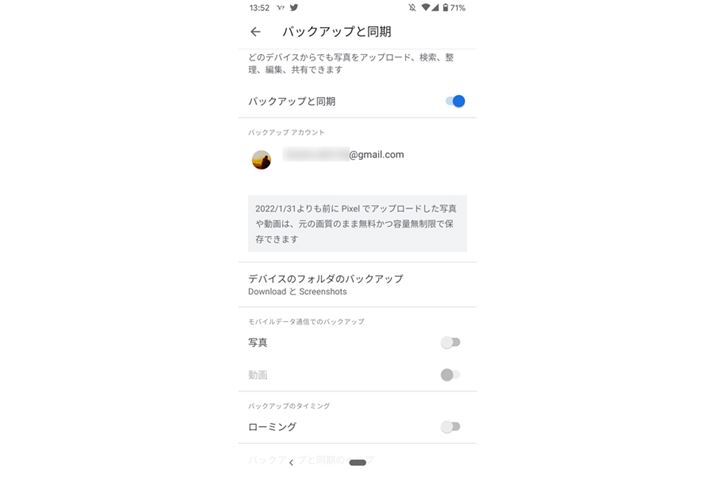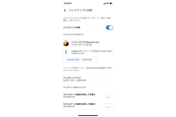また、モバイルデータ通信を使ってバックアップするかどうかも設定できる。通信会社との契約データ通信量を消費しないようにするには、写真、動画ともオフにしておこう。オフにした場合は、Wi-Fi接続時にのみバックアップが実行される。
