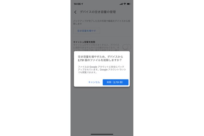 iOSはさらに、「空き容量を増やす」をタップ。確認の画面が表示されるので、「削除(削除対象の個数)」をタップする。