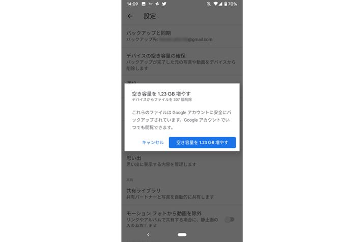 Androidは確認の画面が表示されるので、「空き容量を(確保される容量)GB増やす」をタップする。