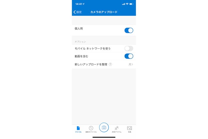 「設定」画面が開いたら「カメラのアップロード」をタップし、iOSは「個人用」、Androidは「カメラアップロード」を有効にすると、バックアップが実行される。
