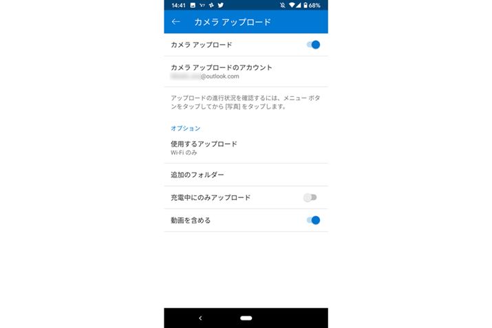 Androidの場合。「カメラアップロード」と「動画を含める」を有効にする。「使用するアップロード」は「Wi-Fiのみ」がおすすめだ