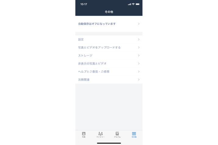 その段階で有効にしていなくても、設定で管理可能だ。画面右下の「その他」をタップすると、開く画面で「自動保存はオフになっています」(Androidは「自動保存はオフです」)と表示されるのでタップし、オンにすればいい。