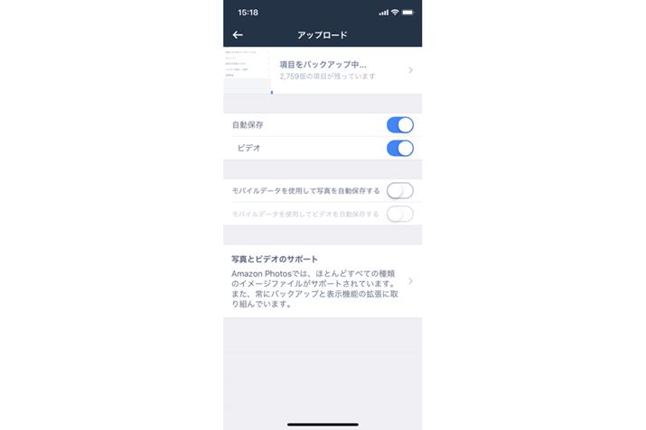 また、同じ画面で「設定」→「アップロード」(Androidは「自動保存」)をタップすれば、ビデオのバックアップも追加できる。モバイルデータ通信は、使用しない設定がいいだろう。