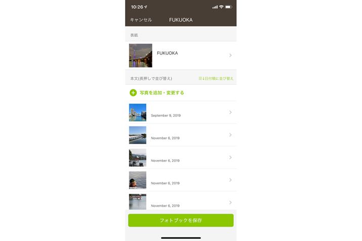 写真を確認。写真をタップしてコメントを入力したり、ピンチ操作によるトリミング、写真の変更などが可能だ。確認・編集したら、「フォトブックを保存」をタップ